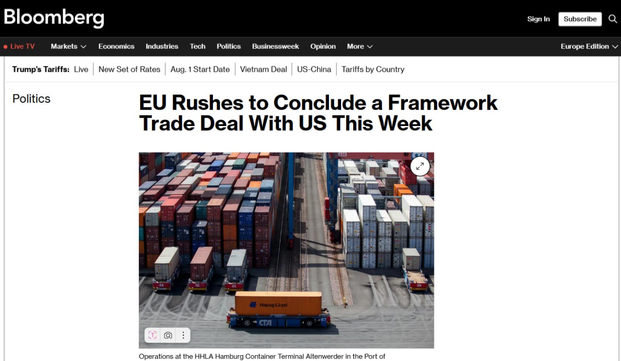 ЕС спешит заключить рамочное торговое соглашение с США на этой неделе, пишет Bloomberg.