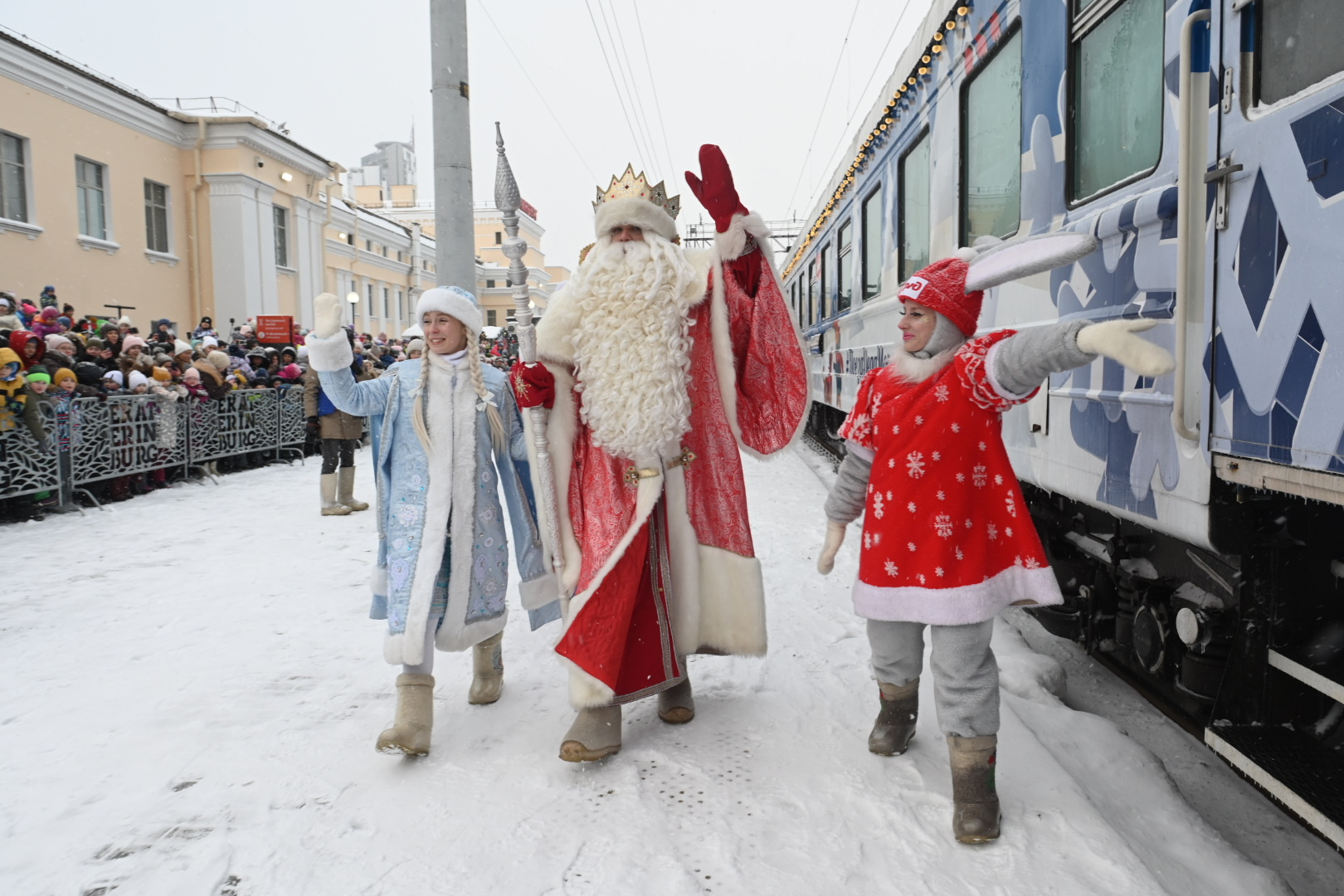 Вместо оленей Дед Мороз приехал на паровозе. В вагонах для детей проходили специальные программы «Сказочная деревня» и кукольный театр.