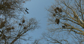 Наши грачи, как правило, зимуют в Западной Европе, отдельные особи живут у нас круглый год. Они гнездятся большими колониями — грачевниками. Гнёзда вьют на высоких деревьях: березах, тополях или (как в данном случае) на лиственницах. В кроне одного дерева могут располагаться десятки гнезд. Грачи используют их много лет подряд и каждую весну проводят капремонт — подновляют.