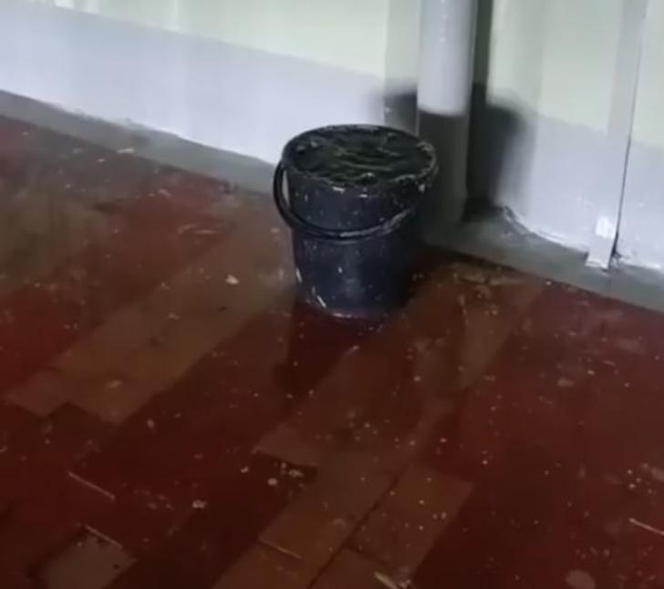 На видео четко видно, что в доме активно протекает крыша. Вода полностью заполнила ведро и залила весь пол на последнем этаже. Вода медленно стекает по стенам, что ведет к разрушению строительных материалов.