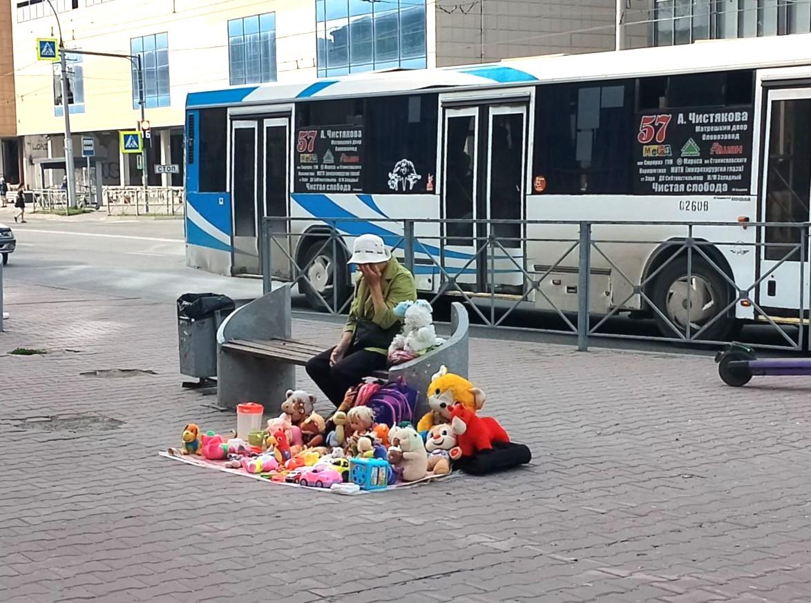 С наступлением теплых дней на центральные площади и улицы пенсионеры выходят торговать, чтобы немного поправить свое финансовое положение, пообщаться и избавиться от ненужных вещей. Спонтанные блошиные рынки постоянно меняют места дислокации. Утром 30 июля такой образовался на площади Маркса: пожилая женщина прямо на брусчатку выложила на покрывале подержанные игрушки, школьные рюкзачки и детскую посуду.