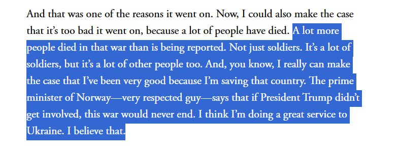«В этой войне погибло гораздо больше людей, чем сообщается. Не только солдат. Много солдат, но и много других людей. И, знаете, я действительно могу сказать, что я был очень хорош, потому что я спасаю эту страну. <…> Я думаю, что я оказываю большую услугу Украине».