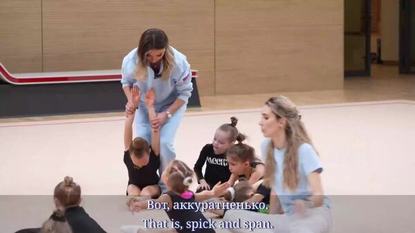 Будущим звездам российского спорта Кабаева на собственном примере показывает, как нужно выполнять тот или иной элемент и даже садится на шпагат перед юными гимнастами, чтобы можно было со стороны взглянуть на верную постановку. «Видишь, не страшно же. Я тебя поздравляю, ты преодолела свой страх. Молодец», — поддерживает она учениц.