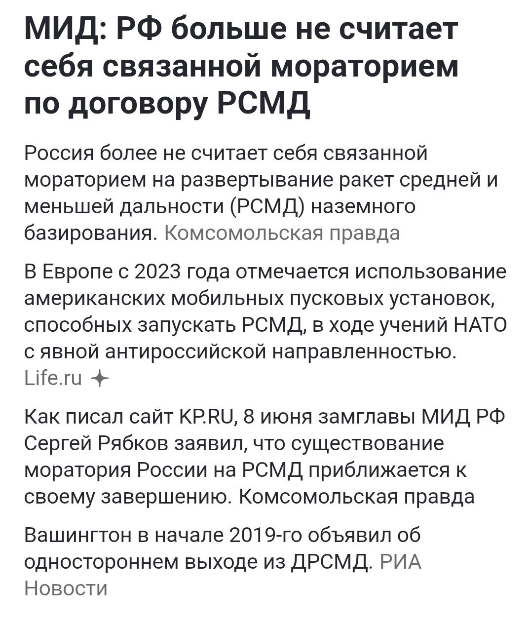 Ну наконец-то. Не прошло и 6 лет с момента выхода США из договора ДРСМД и трёх с половиной лет войны, в ходе которой США и ее сателлиты обстреливают Россию, с территории гос-ва 404, ракетами средней дальности и дронами-дальнолетами, как наш МИД признал что, по словам замглавы МИДа Рябикова, " Запад так и не оценил сдержанность Москвы после выхода из ДРСМД и не ответил взаимностью". Дождемся ли теперь появления наших Искандеров у наших кубинских друзей и прочих бравых хуситов? Или ещё пяток лет подождем?