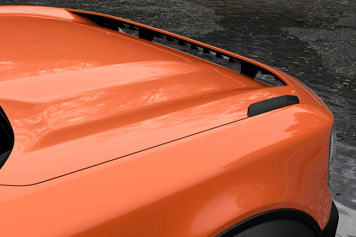 Модель получила массивный обвес из некрашеного пластика по периметру кузова, включающий расширенные накладки на колёсные арки. В нижней части переднего бампера предусмотрен воздухозаборник, на чёрной крыше можно увидеть интегрированный в переднюю часть лидар, на боковинах – выдвижные дверные ручки, корму украсили спойлером и «запаской» на багажной двери с вертикальной ручкой, а по бокам от неё располагаются вертикальные фонари.