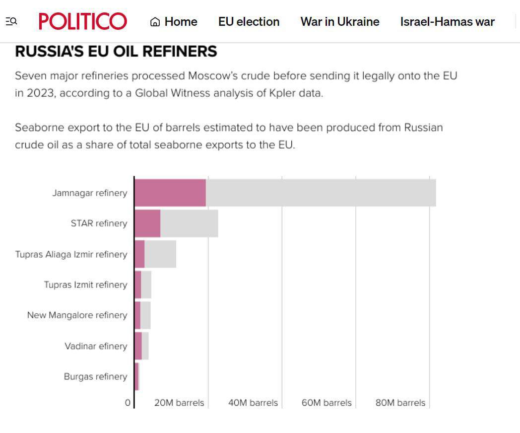 Евросоюз продолжает закупать наш дизель, используя обходные пути и серые схемы через Турцию и Индию. По данным издания Politico, в 2023 году Евросоюз купил 35 миллионов баррелей этого топлива на 1 миллиард евро.