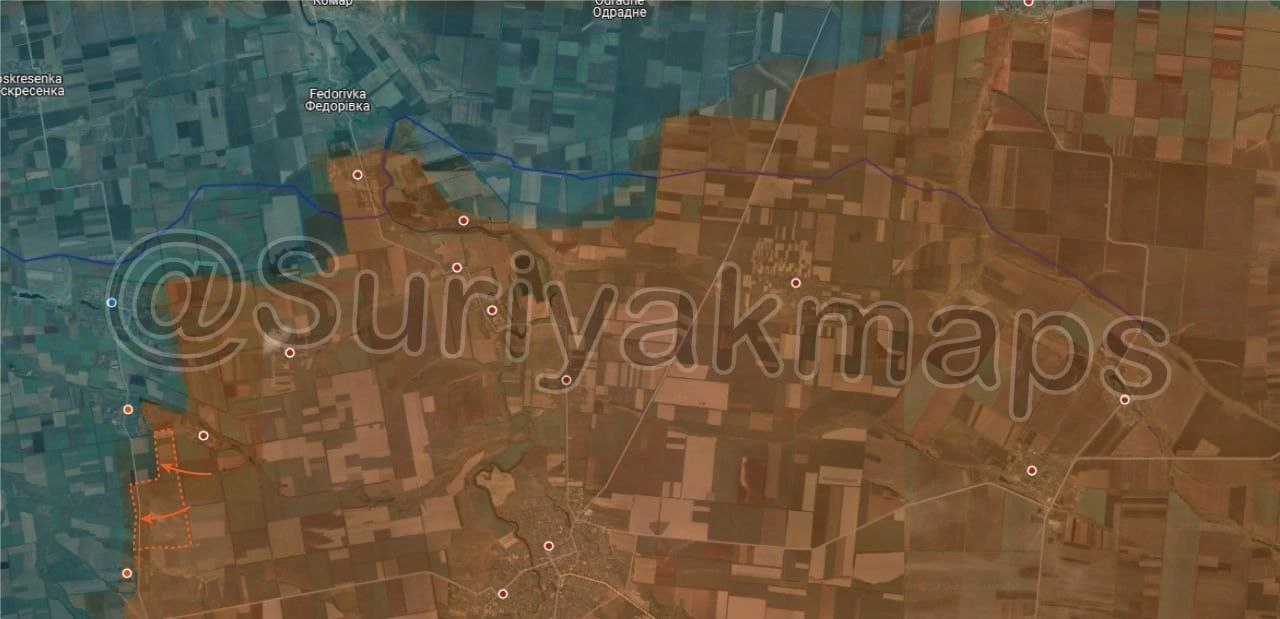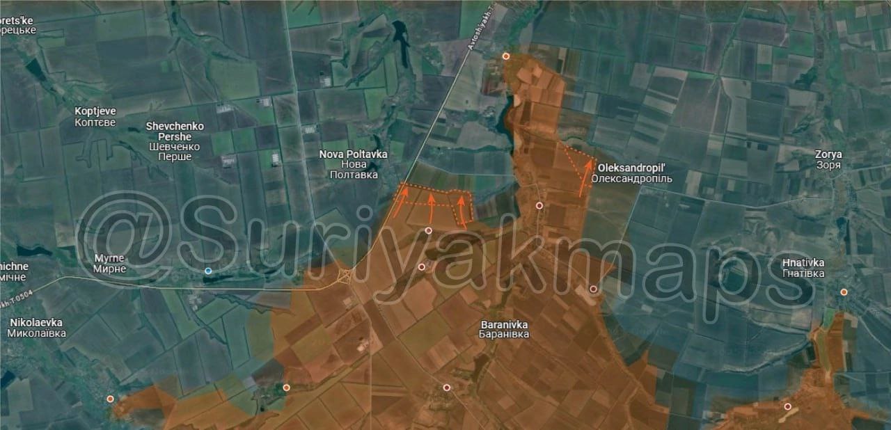 2. Ситуация на Константиновском направлении: Российская армия продолжила наступать севернее Березовки, достигнув окраин Новой Полтавки. Кроме того, российские войска продвинулись северо-восточнее Тарасовки.
