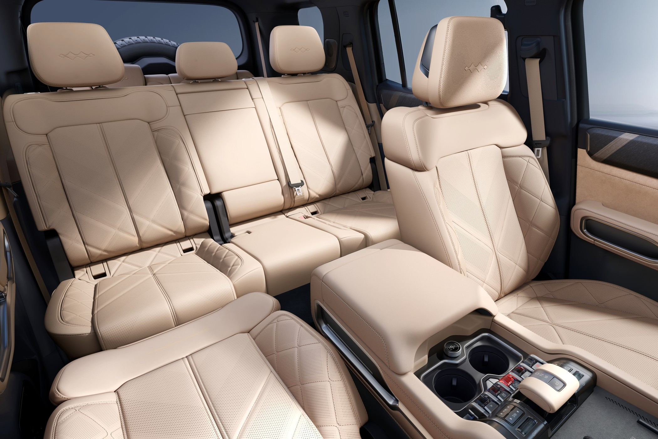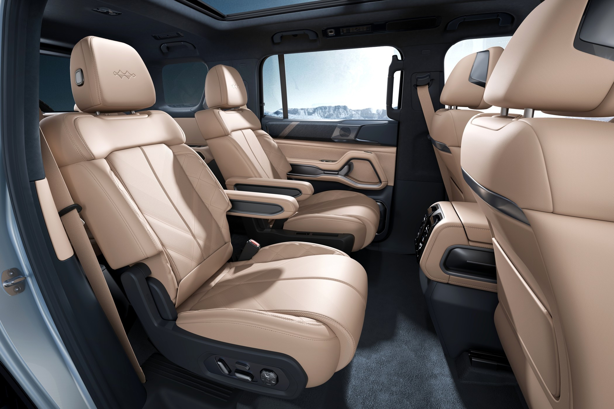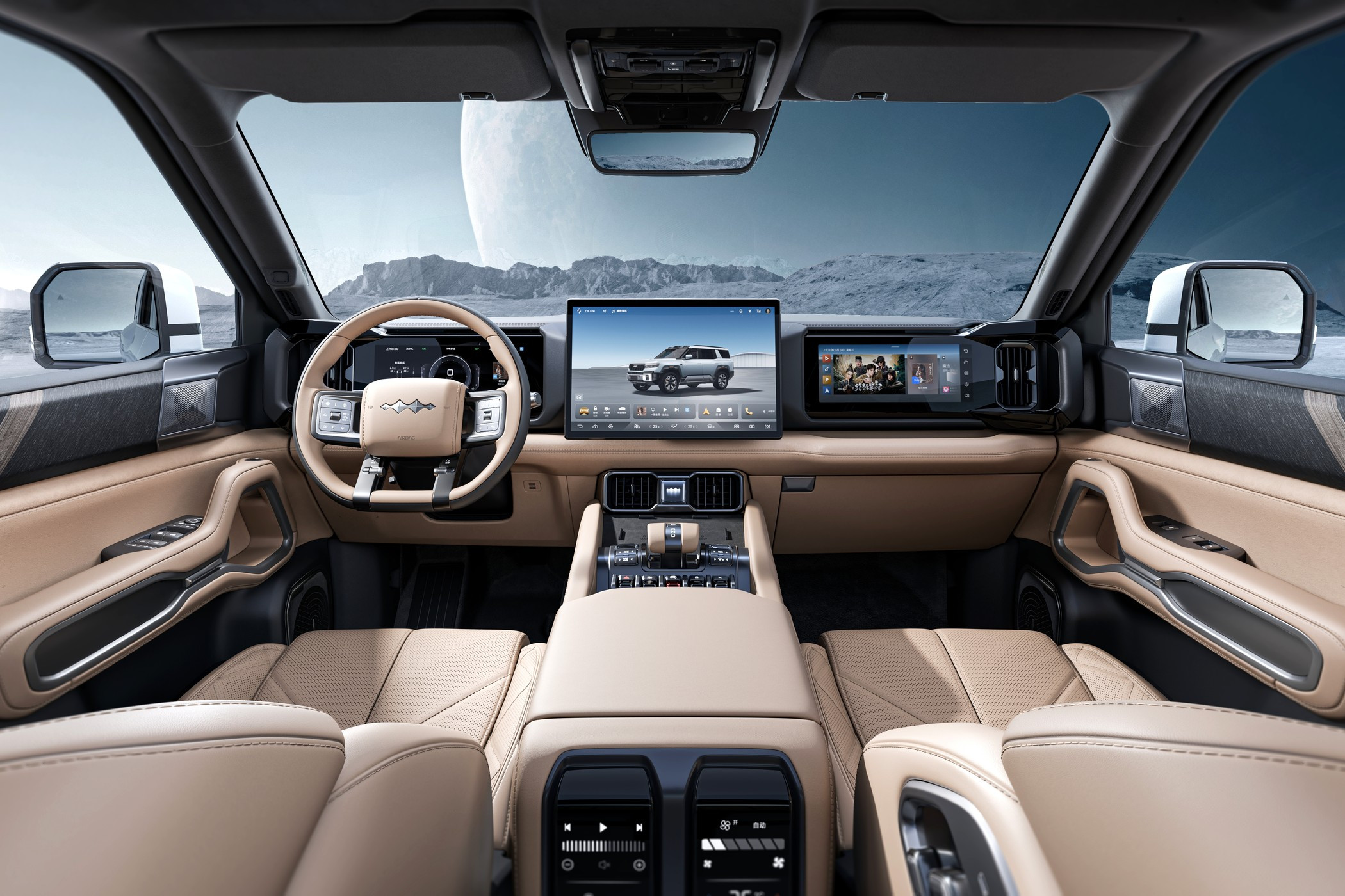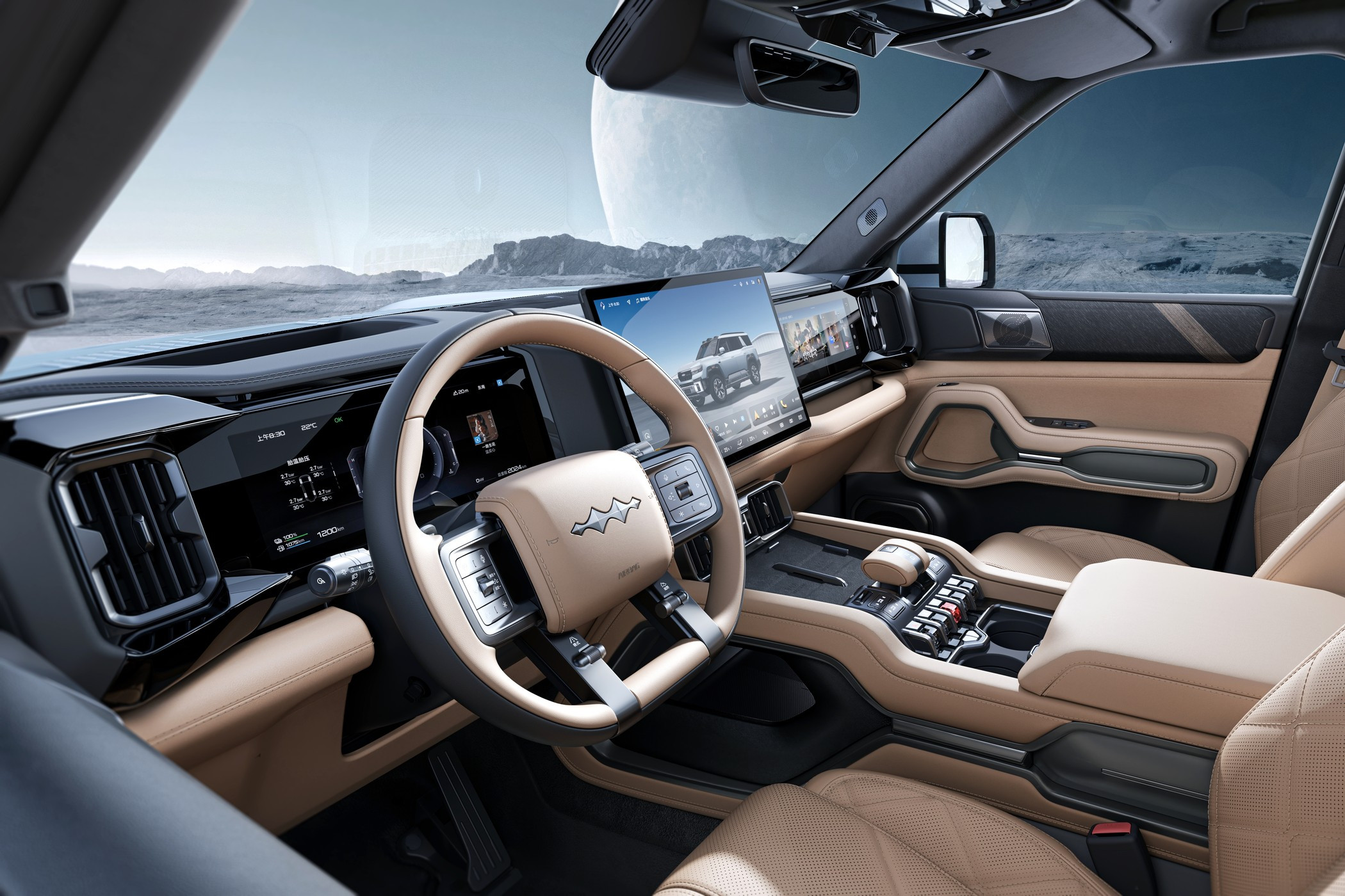 Снаряженная масса внедорожника — 3305 кг, полная масса — 3905 кг. Допустимая масса буксируемого прицепа — 2500 кг. Выступы над лобовым стеклом — это лидар и радары, необходимые для работы автопилота и других электронных ассистентов водителя. Любопытно, что значительную часть ездовой и бортовой электроники для Leopard 8 поставляет компания Huawei.