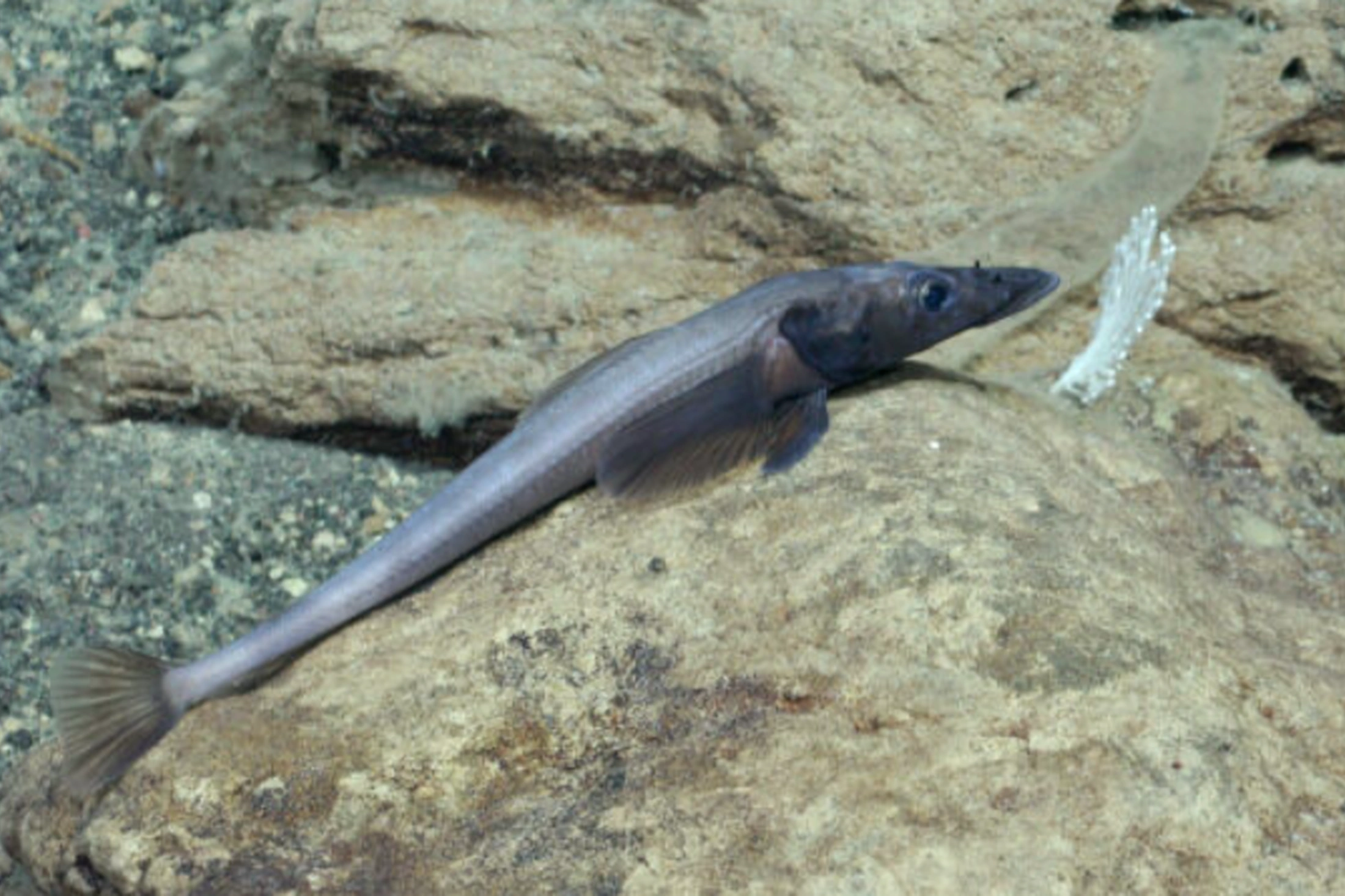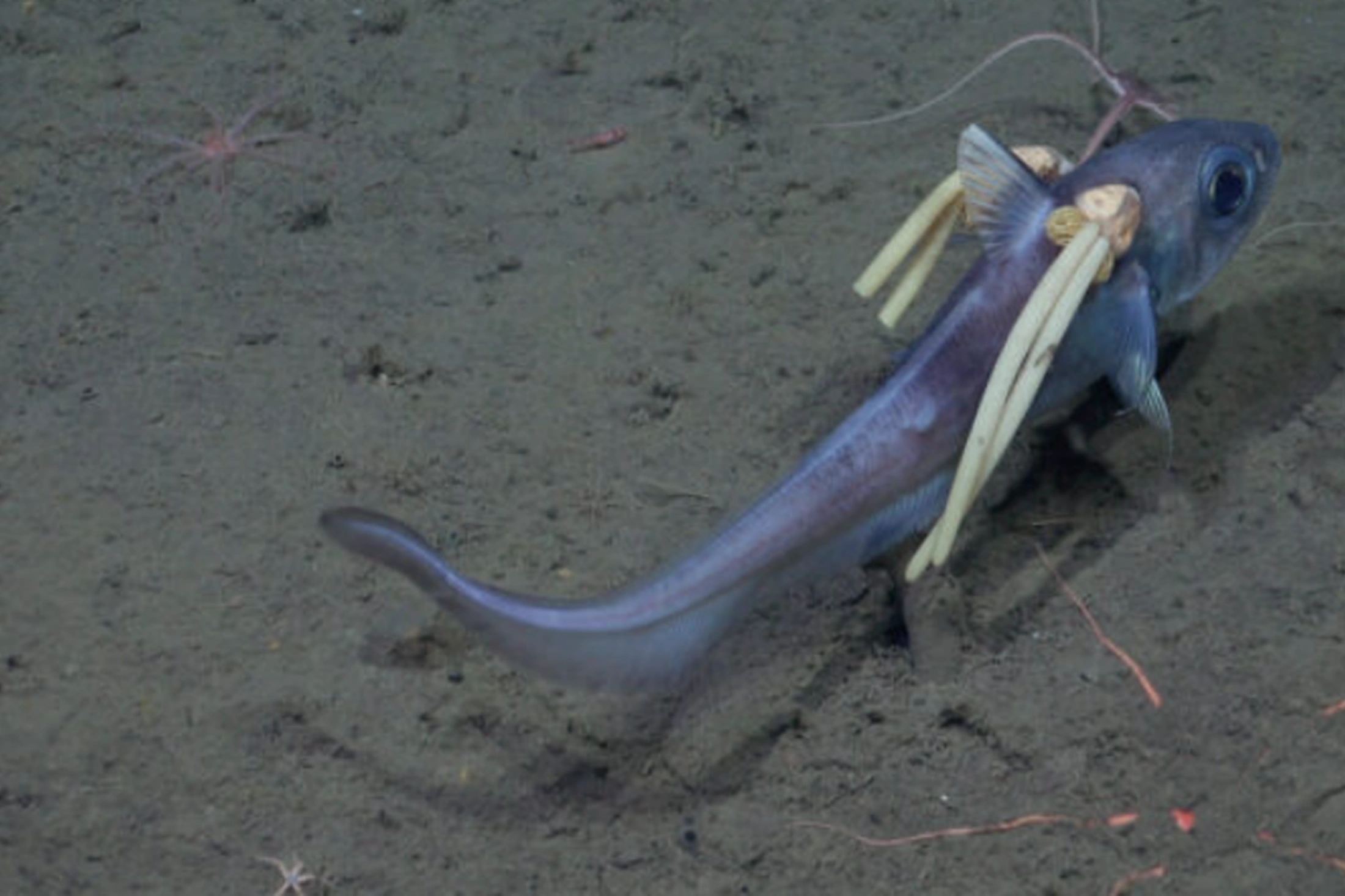 Рядом была зафиксирована менее приятная сцена: рыба-макрурус с паразитическими веслоногими рачками — предположительно Lophoura szidati — застрявшими в жабрах, будто странные косички.