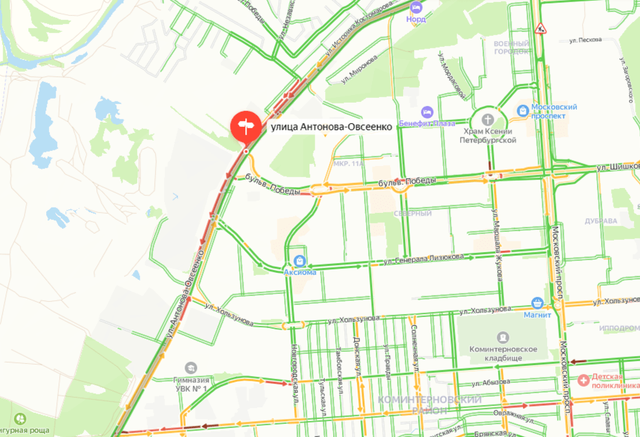 Судя по данным «Яндекс. Карт», движение затруднено не только на улице Антонова-Овсеенко, но и на бульваре Победы.
