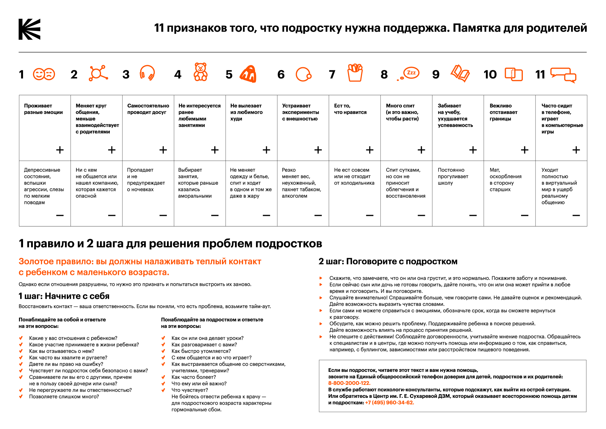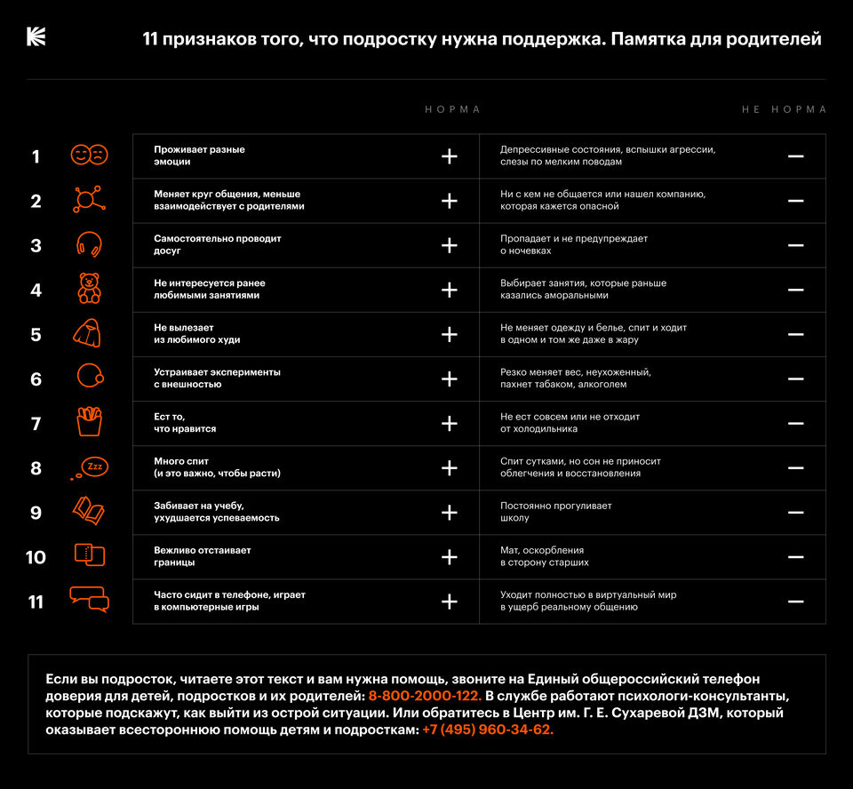 Вместе с практикующими психологами, чьи цитаты приведены в этом материале, Кинопоиск составил памятку для родителей. Она подскажет, когда поведение подростка выходит за грани нормы, с какими проблемами сталкиваются дети и что с этим делать. Распечатайте ее и повесьте на видное место, но лучше там, где она не будет мозолить глаза вашему ребенку!