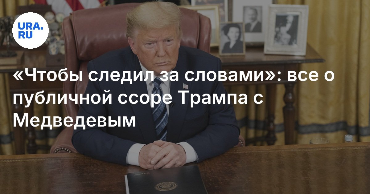 Президент США Дональд Трамп выступил с резкой критикой в адрес заместителя председателя Совета безопасности России Дмитрия Медведева после его заявлений по поводу установленного Вашингтоном срока для РФ по урегулированию ситуации на Украине. Трамп подчеркнул, что подобные высказывания Медведева приближаются к «очень опасной территории». Американский лидер посоветовал российскому политику «следить за своими словами». Подробнее о публичной ссоре Трампа и Медведева — в материале URA.RU.