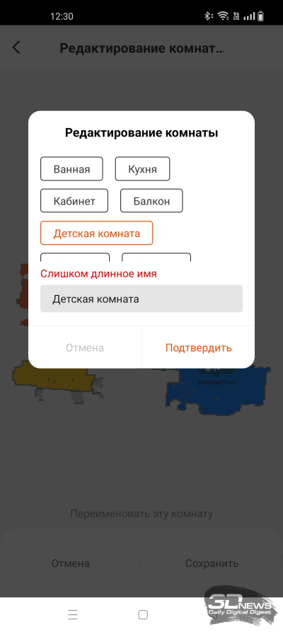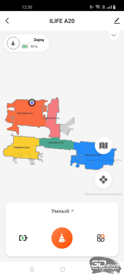 Робот-пылесос строит карту помещения. После ее построения система сама разбивает квартиру на условные «комнаты», которые, конечно, не всегда совпадают с реальными. Ничего страшного в этом нет: в редакторе карт вы можете сами объединять и разделять области, задавать им новые имена, выбирать цвет, устанавливать виртуальные стены и многое другое. Да, первым делом A20 объезжает помещение и строит карту. Вы можете сохранить несколько карт помещения (до пяти). Затем производится уборка квартиры или комнаты — в зависимости от того, что вы выбрали в приложении.