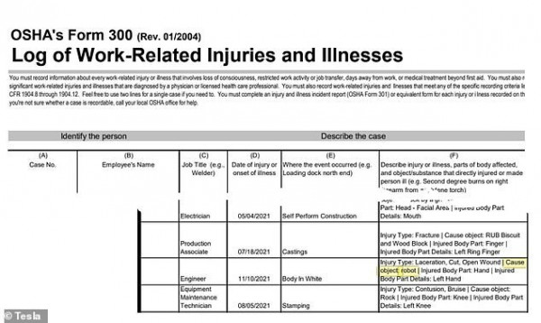 Этот случай был включён в ежегодный отчёт о травмах за 2021 год. Кроме того, сообщается, что согласно сведениям адвоката Ханны Александр этот отчёт был отнюдь не полным. "У нас было несколько работников, которые получили травмы, - сказала адвокат, - и один рабочий, даже умер от теплового удара еще на этапе строительства завода, но эти случаи в документах не фигурируют. Известно, что еще в 2018 году Tesla не указала о случаях 36 травм. Согласно обзору The Information, в 2022 году почти каждый 21-й работник завода Tesla Giga в Техасе получил травму на рабочем месте. В сравнении с этим средний показатель в автомобильной отрасли травмированных другой: 1/30. Более серьезные травмы на заводе "Тесла" получал каждый 26-й сотрудник, тогда как средний показатель в отрасли на других крупных автомобильных заводах США составил 1/38. Т.е. каждый 38-й работник таких предприятий получал ранения, которые требовали медицинского вмешательства и отсутствия на рабочем месте в течение некоторого времени и/или перевода после инцидента на другую должность по причине невозможности выполнять прежние обязанности. В отчетах OSHA Tesla говорится о растяжениях, порезах и переломах, полученных рабочими в результате столкновения с машинами, а также о заболеваниях, вызванных контактом с токсинами, такими как аммиак.