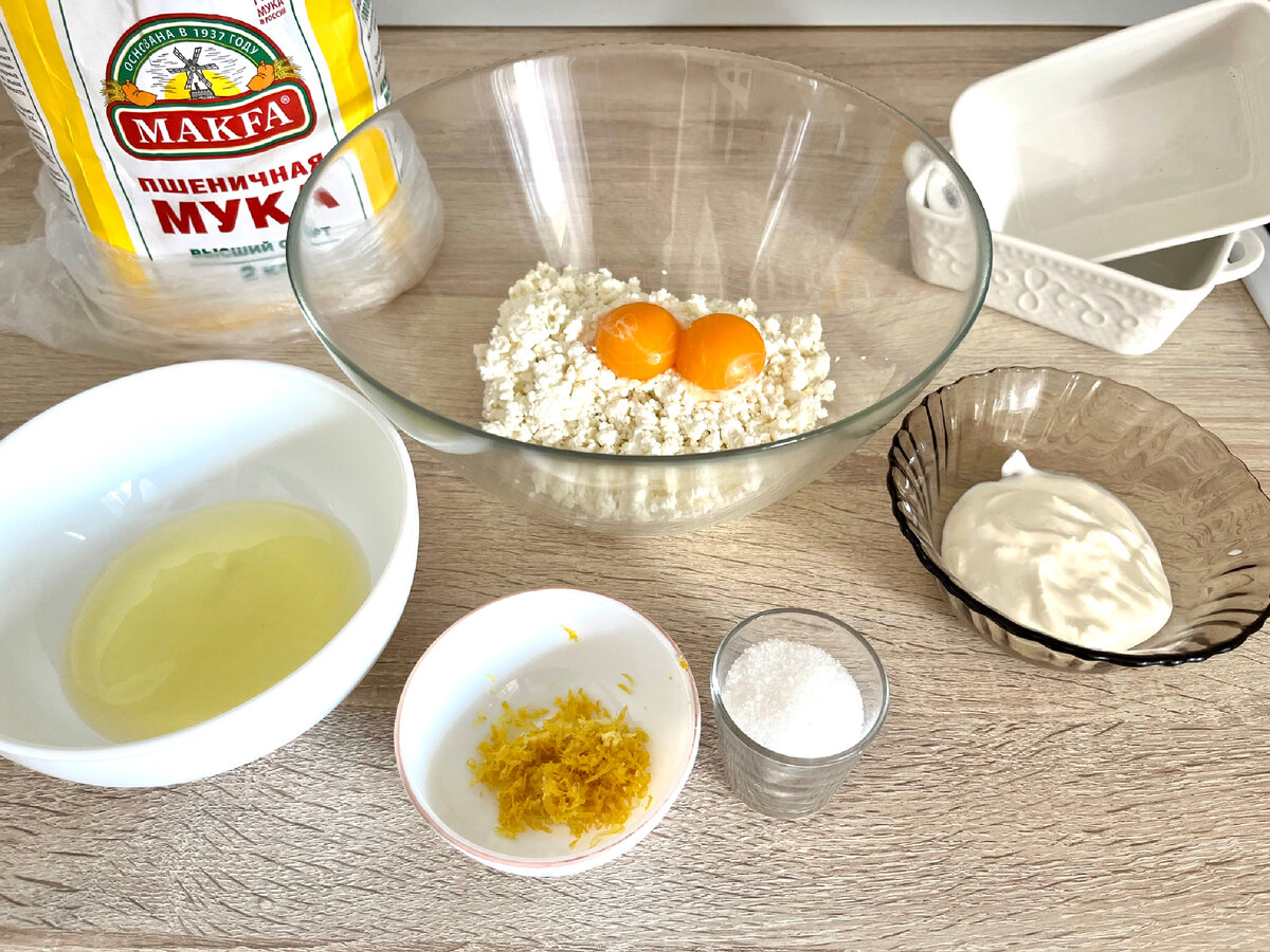 В чашу кладем творог, сахар, сметану, желтки, муку и натертую цедру лимона.