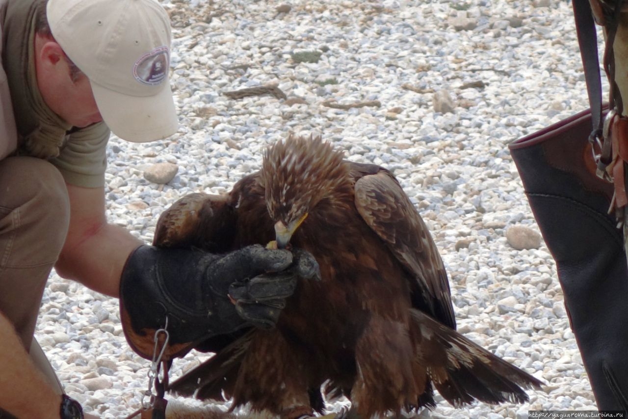 Сову и филина посадили на специально оборудованные столбы-присады. А вот сокола и орла поочередно запускали в небо, где они порою пропадали из вида, но, приученные к обману, послушно изображали охоту на потрепанную шкурку лисы. Получив кусочек мяса, птицы на руках смотрителей возвращались в вольеры.