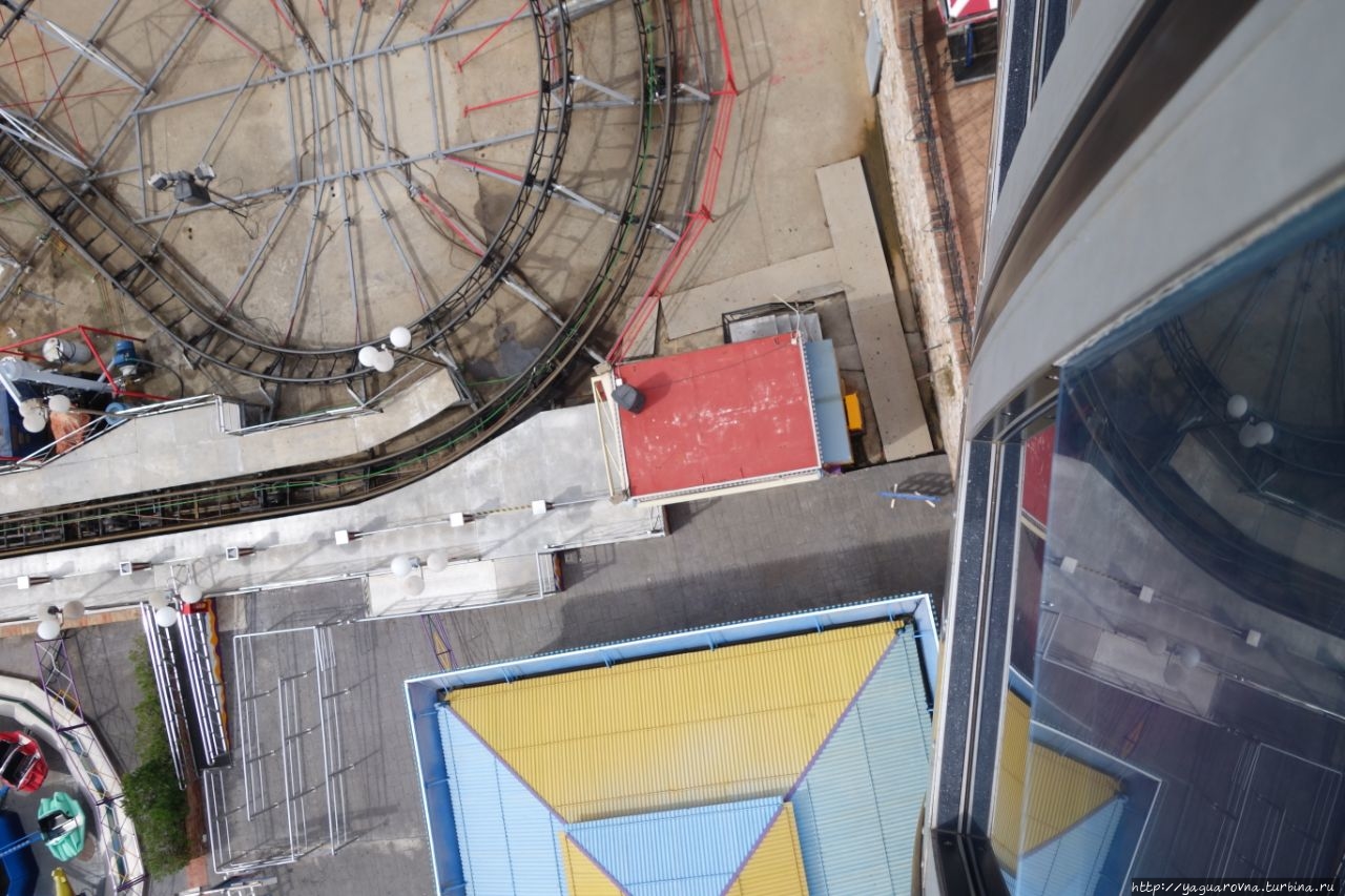 Сразу после начала подъема четырехместная кабинка проплывает над аттракционами.