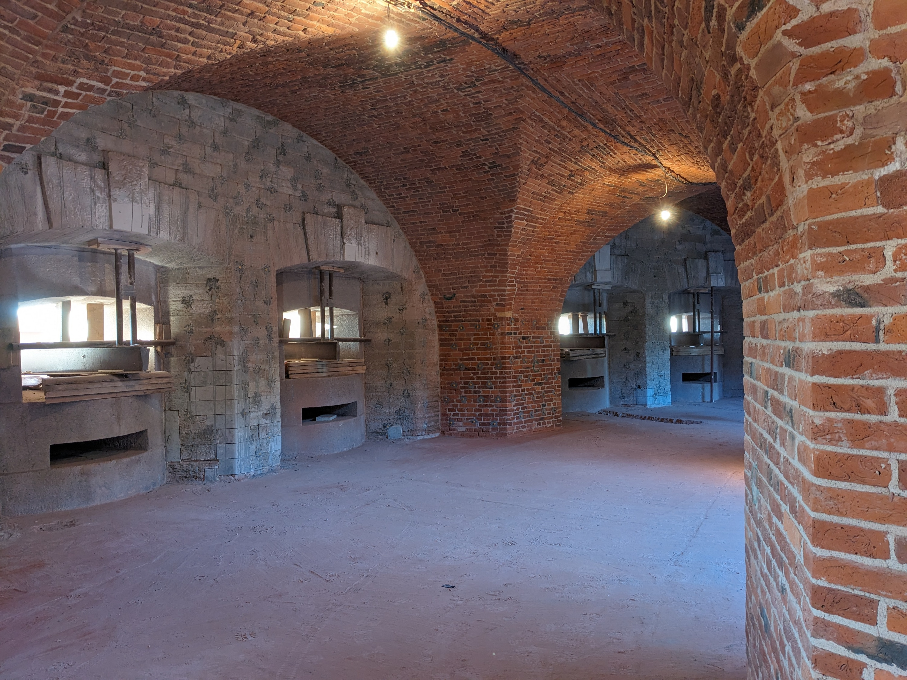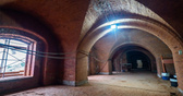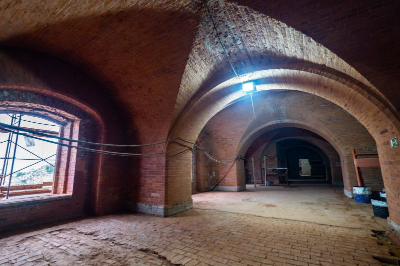 Но стены толщиной около трех метров укреплены изнутри цементным раствором, утраченные фрагменты кладки восстановлены с использованием исторических кирпичей с клеймом, раскрыта левая лестница на второй этаж башни, а место правой, утраченной, расчищено — ее будут воссоздавать. А пока мы полюбовались кирпичной кладкой. Оштукатуривать ее не будут — в этом подход реставраторов, работающих на форте «Петр Первый»: планируется оставить кирпич в первозданном виде, чтобы максимально сохранить аутентичность зданий.