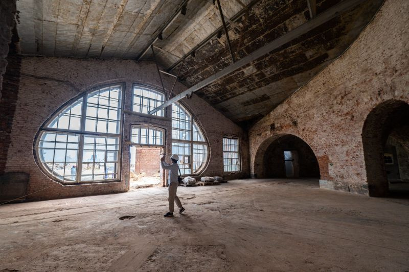 И, пожалуй, самые сложные работы — именно на «Петре Первом». Пока здесь выполнены первоочередные противоаварийные работы. В здании котельной монтируют кровлю и реставрируют фасады, но по соображениям безопасности внутрь журналистов приглашать не стали.