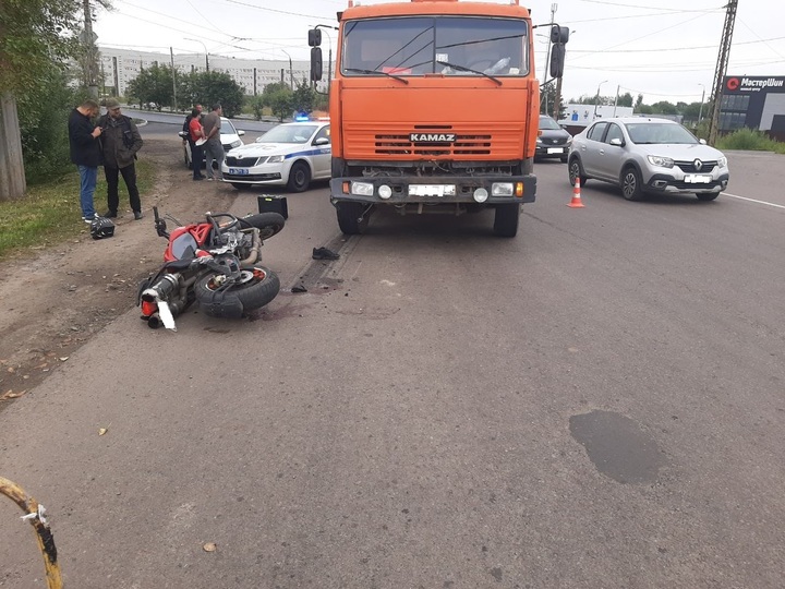 На Пошехонском шоссе мотоцикл столкнулся с КАМАЗом. Мужчина 1954 года рождения, двигавшийся на грузовом транспорте, допустил столкновение с мотоциклистом 2003 года рождения, который ехал с ним в одном направлении. Водитель мотоцикла был госпитализирован с травмами. Известно, что у пострадавшего нет водительского удостоверения.