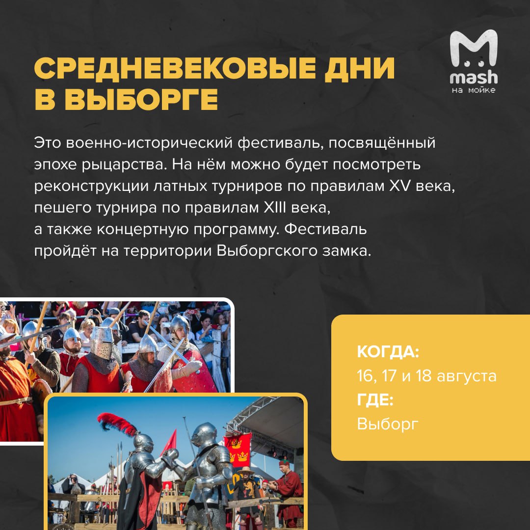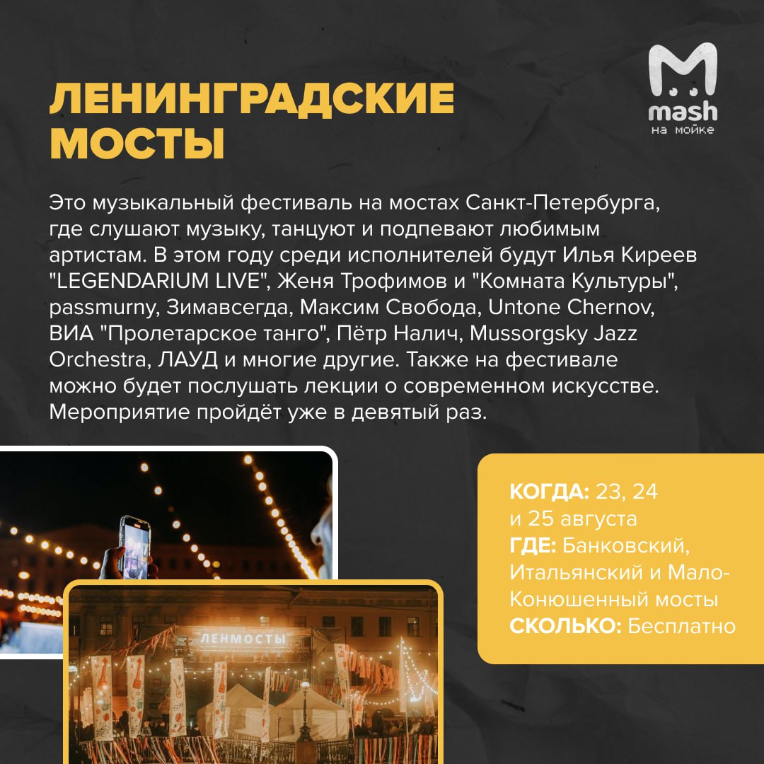 Середина лета уже позади, а значит, надо провести последний месяц на полную. Собрали для вас, любимые подписчики, традиционный event-дайджест с крутецкими тусовками в Питере и Ленобласти.