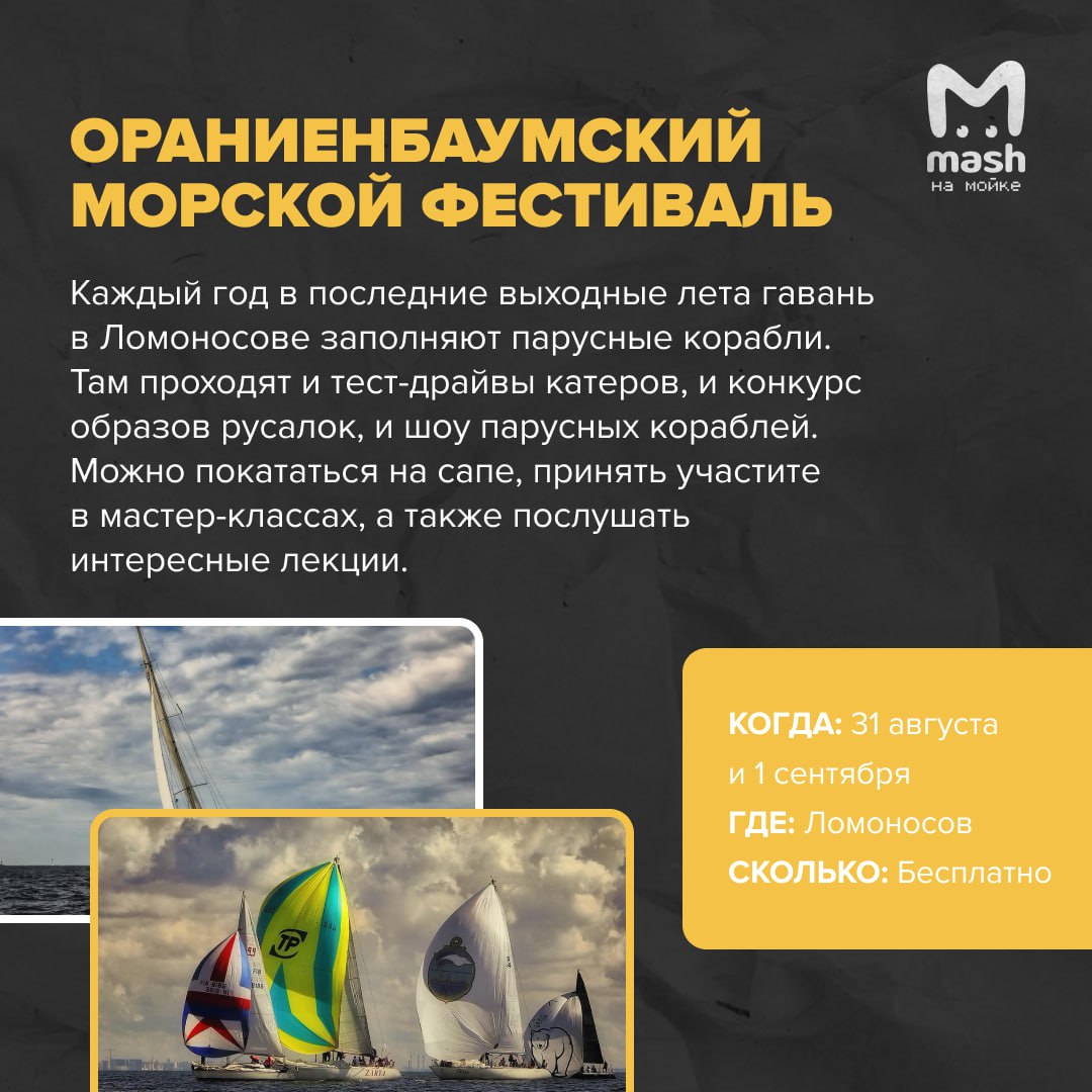 В меню хороводы на Дворцовой, долгожданные "Ленинградские мосты" и даже рыцарский фест в Выборге. А в последний летний день советуем отправиться в Ломоносов и насладиться морским праздником — прокатиться на сапе и посмотреть шоу парусных кораблей.