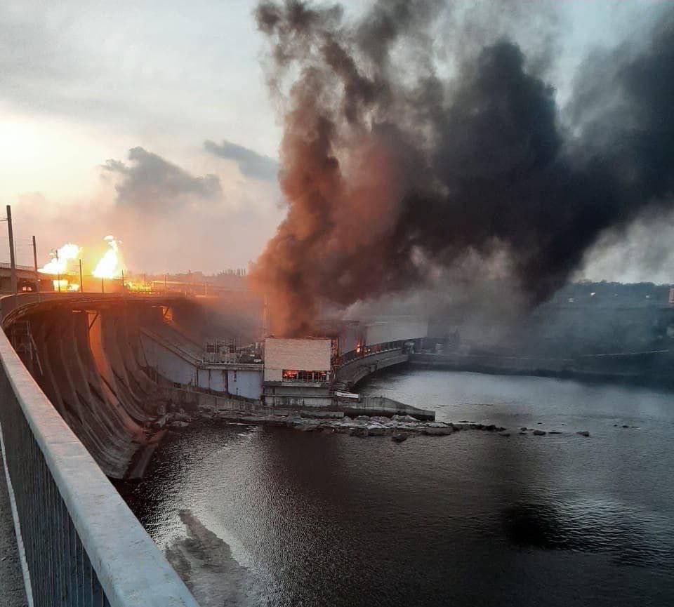 Пожар начался на ДнепроГЭС после прилета, пишут местные СМИ.
