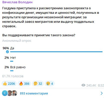 Вячеслав Володин присоединился к резонансной теме конфискации имущества за нелегальный завоз мигрантов.