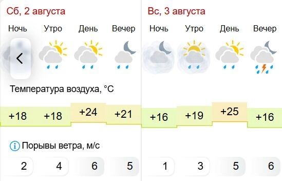По данным gismeteo, в субботу, 2 августа, утром ожидается около +18 градусов. Днем потеплеет до +24, к вечеру столбик термометра опустится до +21 градуса. В течение суток прогнозируются дожди.