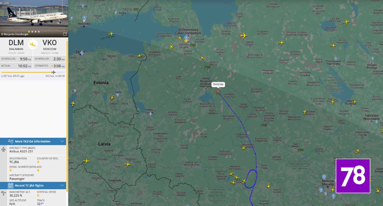 По данным 👾, самолет из Даламана (Турция), летевший во Внуково, был перенаправлен ночью на запасной аэродром в Петербург.