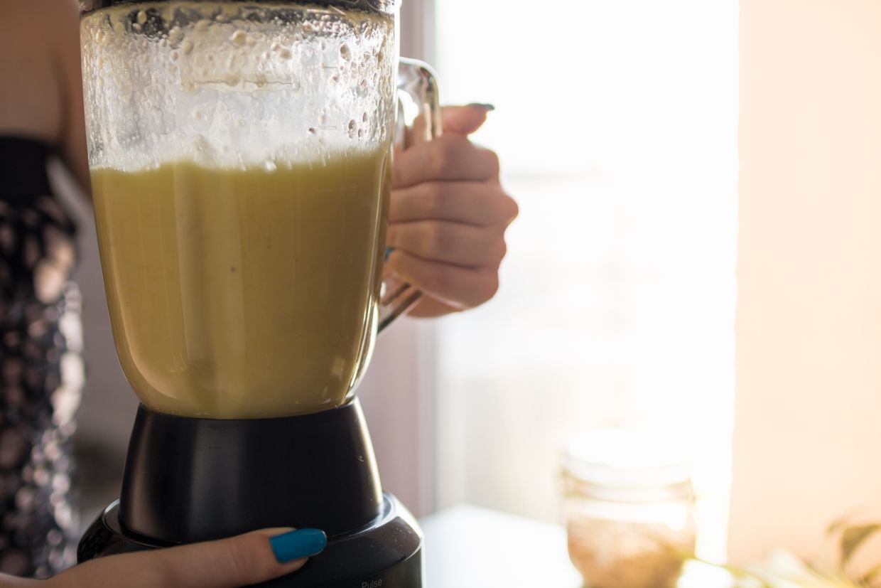 4. Измельчите блендером все ингредиенты до консистенции пюре. Добавьте сливки и яблочный сок, тщательно перемешайте.