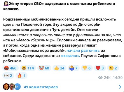 Телеграм-канал навальнистов и близкие к ним распространяют информацию, что на Поклонной горе была задержана одна из лидеров движения «Путь домой» Паулина Сафронова. Она пришла на очередную акцию «жен мобилизованных» с маленьким ребенком.