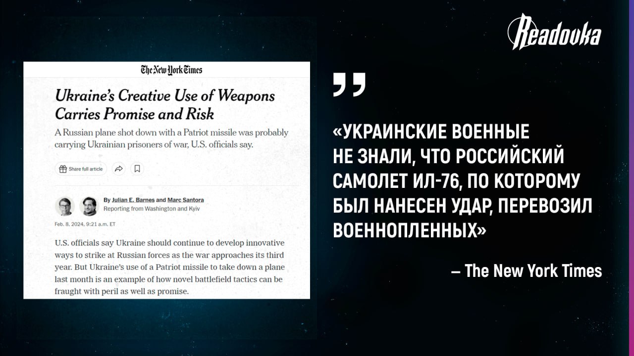 Однако NYT решил смягчить принятие «пилюли правды» американских обществом и заявил, что ВСУшники якобы не знали, что на сбитом самолете были украинские военнопленные. Хотя дата и время обмена, а также информация о том, каким самолетом их будут доставлять в Белгородскую область у них была. До этого сбитие Ил-76 ракетой ЗРК Patriot признал французский «анонимный военный чиновник» в беседе с AP.