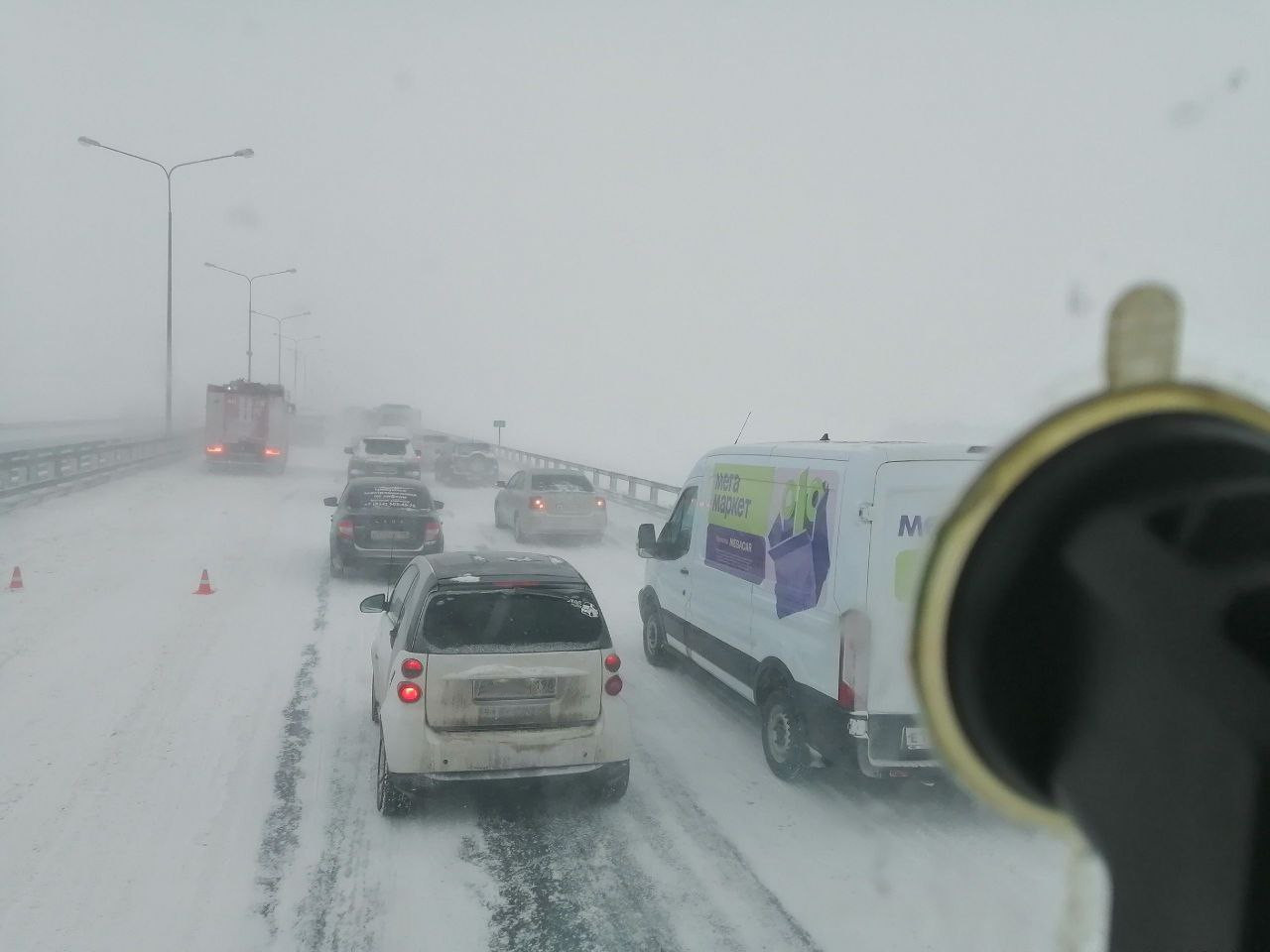 Дорожная авария превратила автомобильную дорогу на дамбе Петербурга в «бутылочное горлышко», а метель сильно снизила видимость и намела снега. Копится пробка.