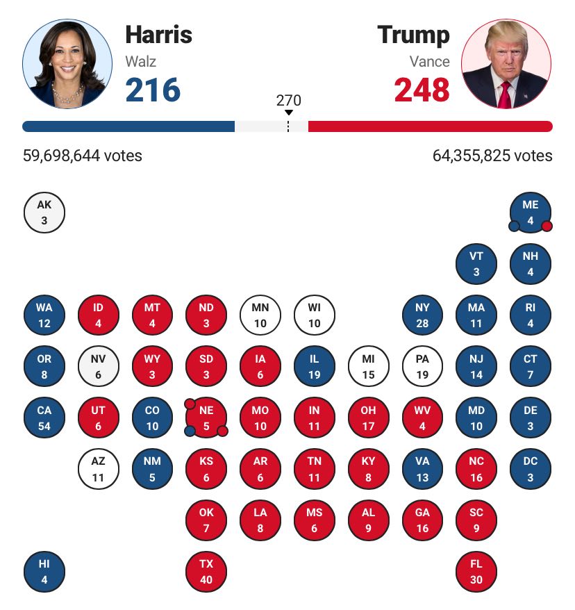 Для победы в выборах нужно заручиться поддержкой как минимум 270 выборщиков.