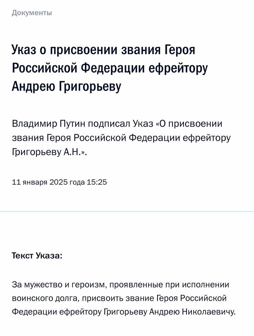 π·πΊπΠΠ»Π°Π΄ΠΈΠΌΠΈΡ ΠΡΡΠΈΠ½ ΠΏΠΎΠ΄ΠΏΠΈΡΠ°Π» ΡΠΊΠ°Π· ΠΎ ΠΏΡΠΈΡΠ²ΠΎΠ΅Π½ΠΈΠΈ Π·Π²Π°Π½ΠΈΡ ΠΠ΅ΡΠΎΡ Π Π€ Π΅ΡΡΠ΅ΠΉΡΠΎΡΡ ΠΡΠΈΠ³ΠΎΡΡΠ΅Π²Ρ Π·Π° ΠΌΡΠΆΠ΅ΡΡΠ²ΠΎ ΠΈ Π³Π΅ΡΠΎΠΈΠ·ΠΌ, ΠΏΡΠΎΡΠ²Π»Π΅Π½Π½ΡΠ΅ ΠΏΡΠΈ ΠΈΡΠΏΠΎΠ»Π½Π΅Π½ΠΈΠΈ Π²ΠΎΠΈΠ½ΡΠΊΠΎΠ³ΠΎ Π΄ΠΎΠ»Π³Π°
