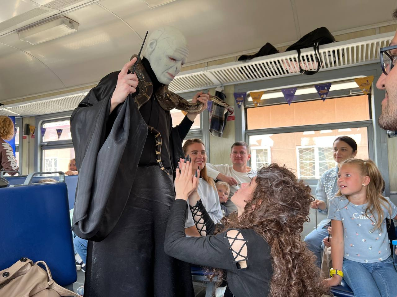 Не обошлось без встречи со злодеями: в поезде появился тот, чье имя нельзя называть. Волан-де-Морт вместе с Беллатрисой Лестрейндж попытались переманить учеников на свою сторону и обучили их трем самым опасным заклинаниям: Империо, Круцио и Авада Кедавра.