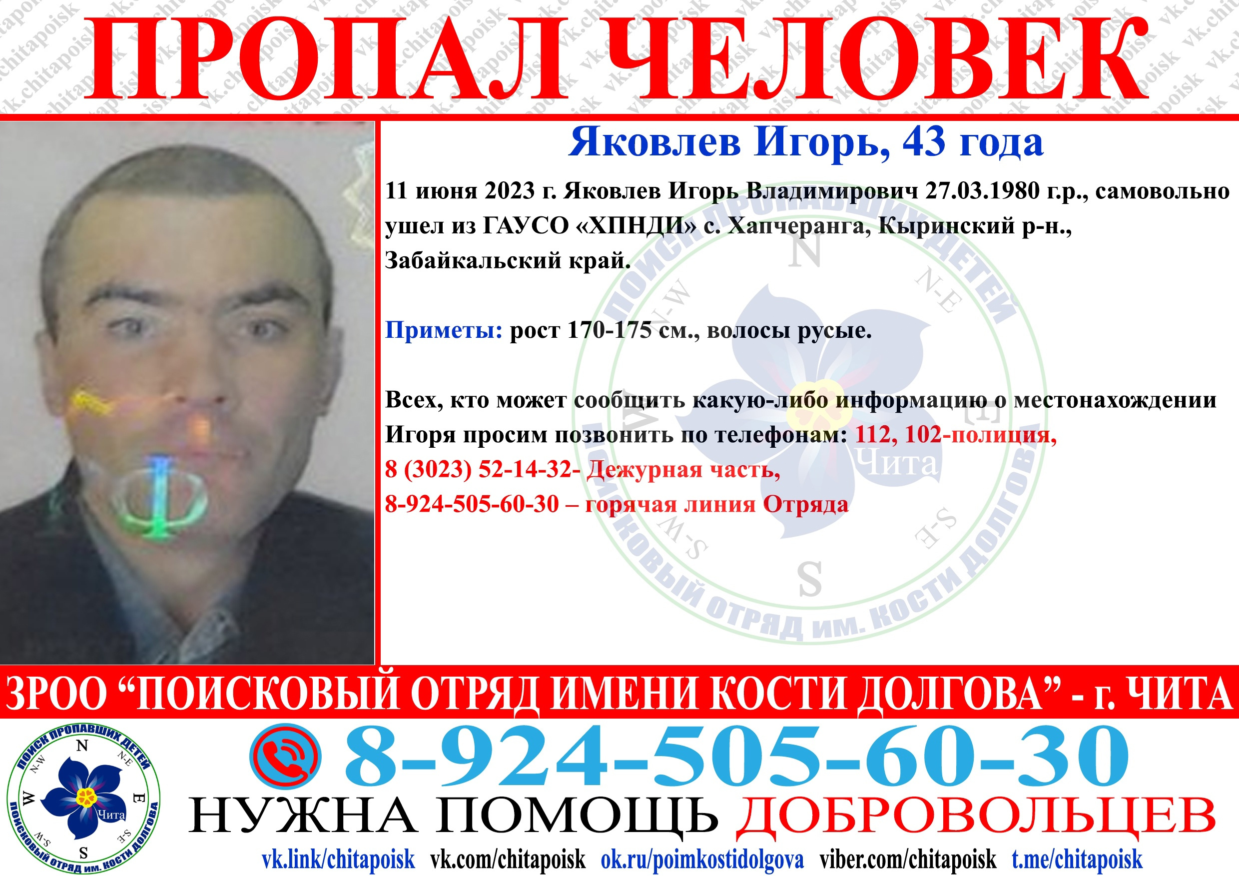 Мужчину, сбежавшего из дома-интерната для граждан, имеющих психические расстройства, в селе Хапчеранга Кыринского района, разыскивают в Забайкалье. Информация о поисках размещена в группе поискового отряда имени Кости Долгова во «ВКонтакте».