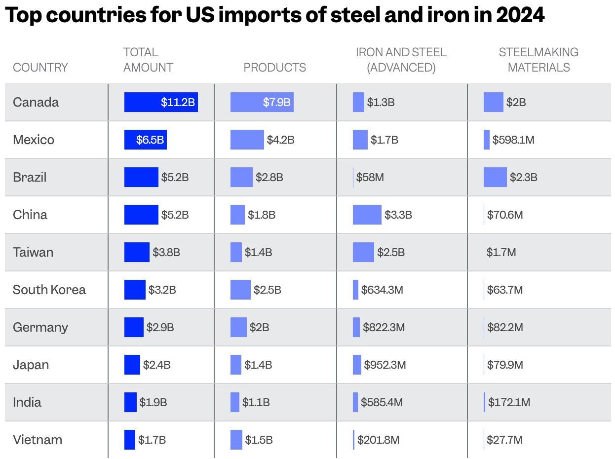 Канада, Мексика и Бразилия являются ключевыми поставщиками стали в США.