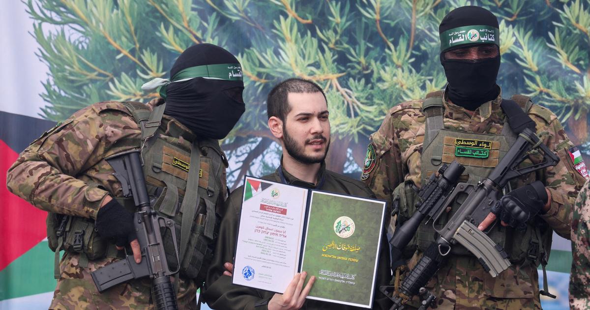 Ensuite, ce sont Eliya Cohen, Omer Shem Tov et Omer Wenkert, enlevés lors de l’attaque du 7 octobre 2023, qui sont montés sur une estrade devant la foule à Nousseirat, dans le centre de la bande Gaza. Comme tous les autres otages remis à la Croix-Rouge avant eux, ils ont été exhibés, un par un puis en groupe, après avoir reçu des certificats. Certains ont reçu des tapes sur l’épaule de membres du Hamas. Ils ont tous salué la foule en souriant.
