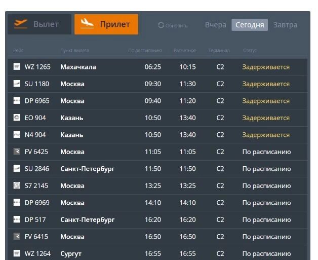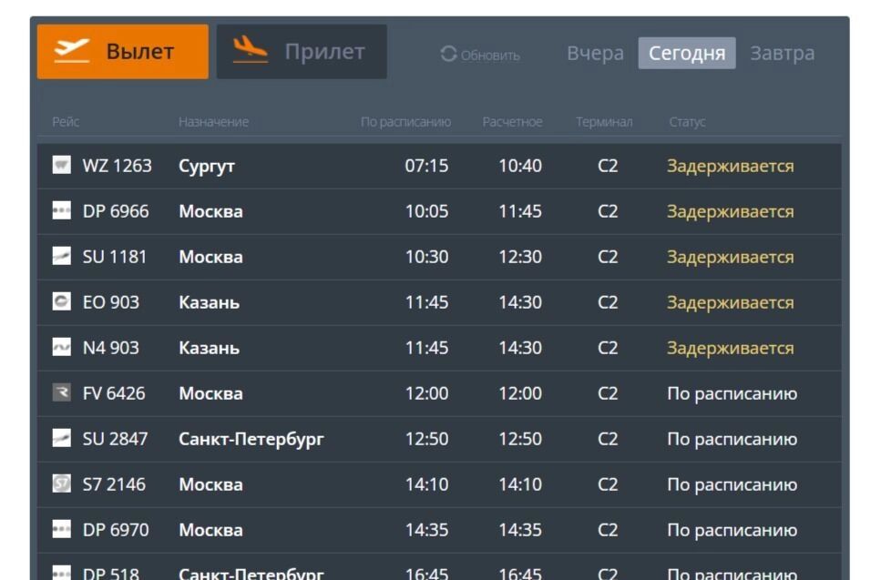 Что касается посадок, что задерживается приземление самолета из Махачкалы. Вместо 06:25 он сядет в 10:15. Самолеты из Москвы перенесли с 09:30 и 09:40 на 11:30 и 11:20. Вылет в Казань сместили с 10:50 на 13:40.