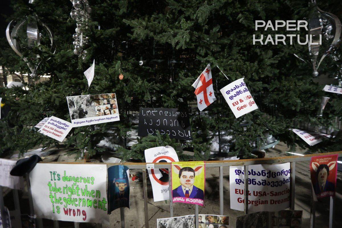 На елку у здания парламента протестующие поместили фотографии демонстрантов и журналистов, пострадавших во время акций протеста — «Эхо Кавказа»