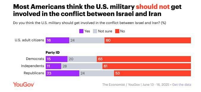 🟥16% респондентов поддерживают идею военного вмешательства США в израильско-иранский конфликт;