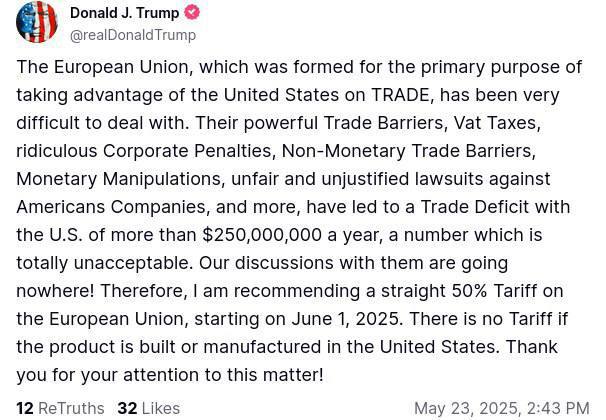 Трамп предложил ввести 50% пошлины в отношении ЕС.