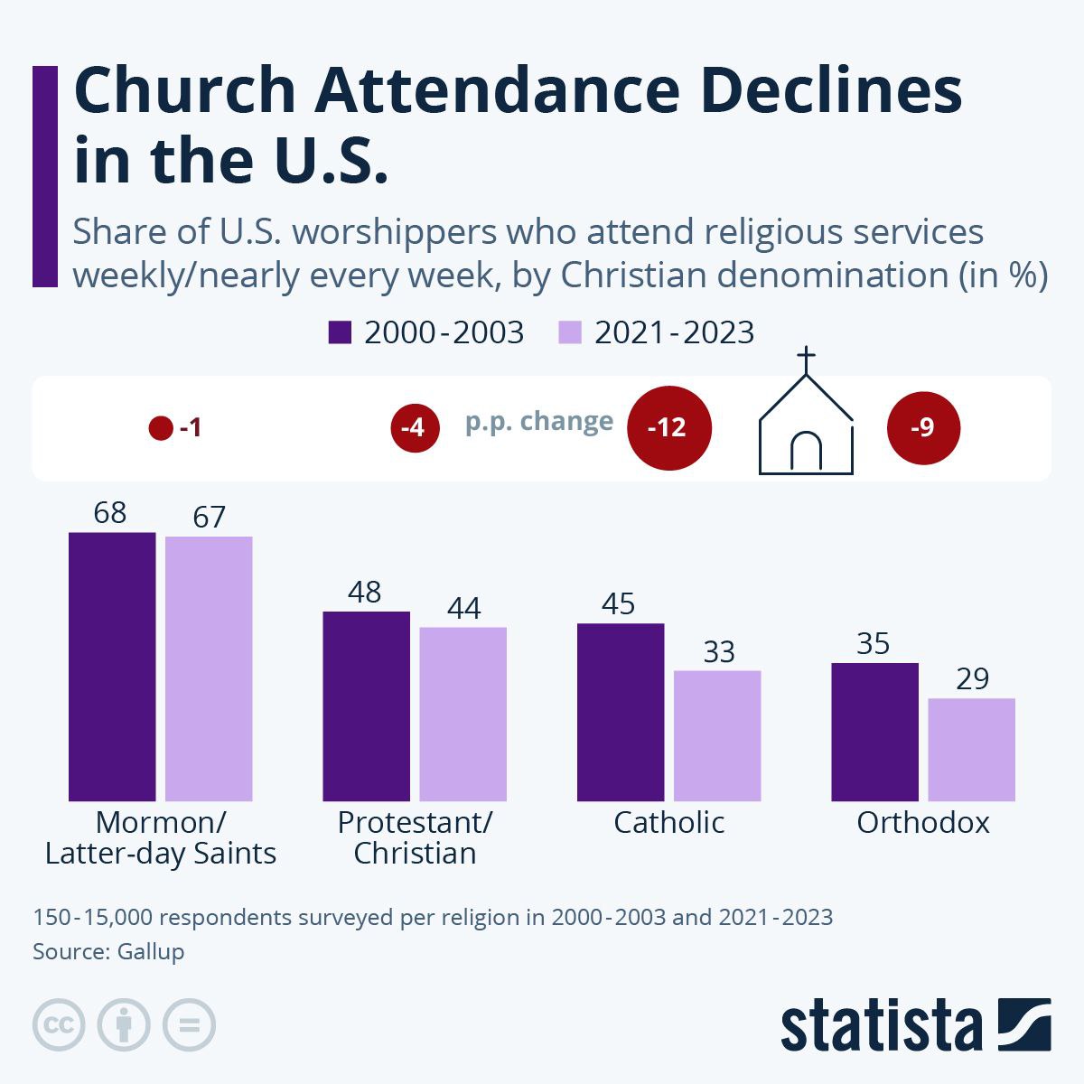 ⛪️Сильнее всего за последние 20 лет снизилась посещаемость церквей в США среди католиков