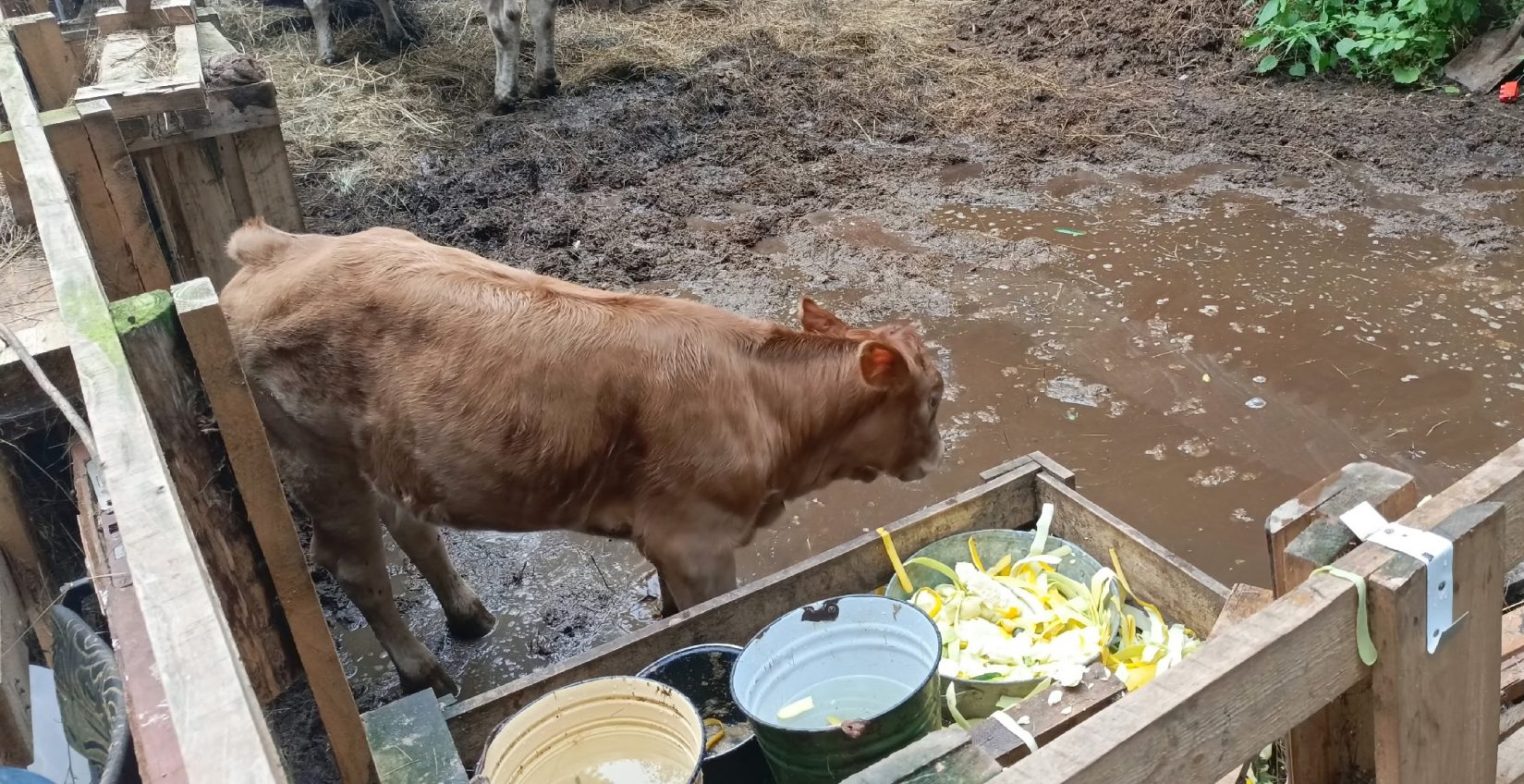 — Начались дожди, а животные стоят за небольшим ограждением по щиколотку в навозной жиже, в воде, которая полностью затопила сарай, предназначенный для животных. О зеленой траве и выгуле нет и речи. Хозяин отказывается выводить воду из загона и ухаживать за коровой, ссылаясь на занятость. Сено, заготовленное неравнодушными людьми для животных, гниет. Жители сами подкармливают и поят корову с теленком.