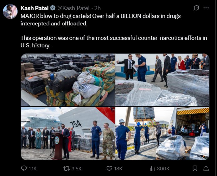 «Перехвачено и вывезено наркотиков на сумму более полумиллиарда долларов. Эта операция стала одной из самых успешных в истории США по борьбе с наркотиками!», – написал он в Х.
