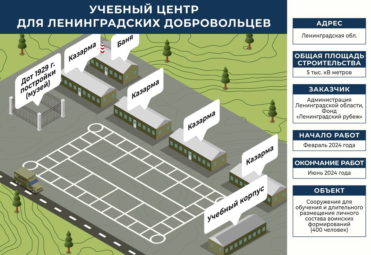 5 тысяч квадратных метров, собственный полигон, банный комплекс и казармы, которые могут вместить до 400 человек – всё это про наш, строящийся с нуля, учебный центр для подготовки ленинградских добровольцев.