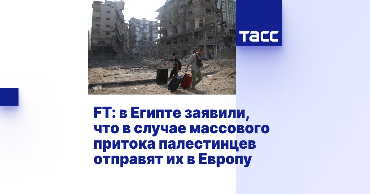 ЛОНДОН, 17 октября. /ТАСС/. Египет активно сопротивляется давлению Евросоюза, который пытается убедить его принять палестинских беженцев. Как сообщает британская Financial Times (FT), в Каире даже пригрозили представителю ЕС начать отправлять палестинцев в Европу в случае массового притока беженцев.