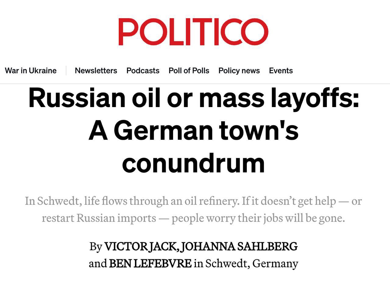 Европейское издание Politico опубликовало пост о проблемах немецкой нефтепереработки из-за санкционных ограничений поставок нефти из России.